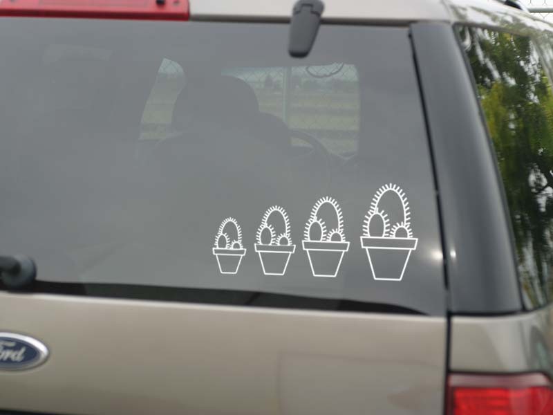 These easy to apply vinyl family of cactus window decals are available in several sizes. Cactus stickers are cut from outdoor rated vinyl and will last for several years. Your cactus decals are easily applied on your vehicle car window or any other flat surface. They can also be removed with ease. Exclusively at FamilyStickers.com